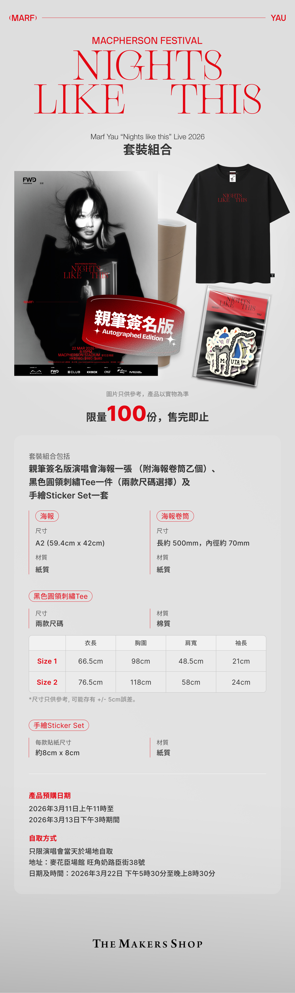 - 只限演唱會當天於場地自取,地址:麥花臣場館 旺角奶路臣街38號 (日期:2026年3月22日 下午5時30分至晚上8時30分)